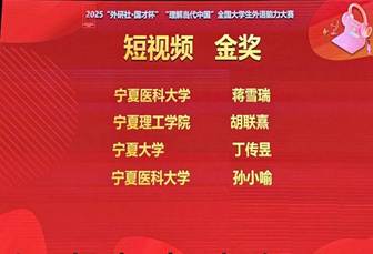 口译赛项,宁夏大学共计获得四金二银八铜,其中英语专业四名选手包揽了全部金奖;演讲赛项,宁夏大学斩获五金四银八铜;宁夏大学共计35名选手参加国际传播综合能力赛项,取得了七金二十二银六铜的好成绩;笔译赛项共获得三金九银二铜;短视频赛项获得一金四银一铜。
