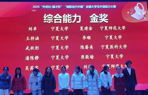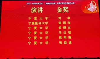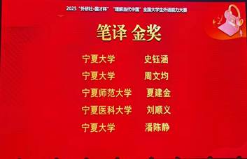 此次大赛不仅是宁夏高校外语教学成果的一次集中展示,更是推进外语教育改革、践行“中外融通、笃学尚行”理念的生动实践。随着闭幕式颁奖典礼的结束,2025年“外研社·国才杯” “理解当代中国”全国大学生外语能力大赛宁夏赛区比赛已圆满落幕。然而对于宁夏大学的学子来说,这又是一个新的起点——金奖选手将有机会继续进军全国赛场,在全国舞台上展示宁夏青年的风采与实力。